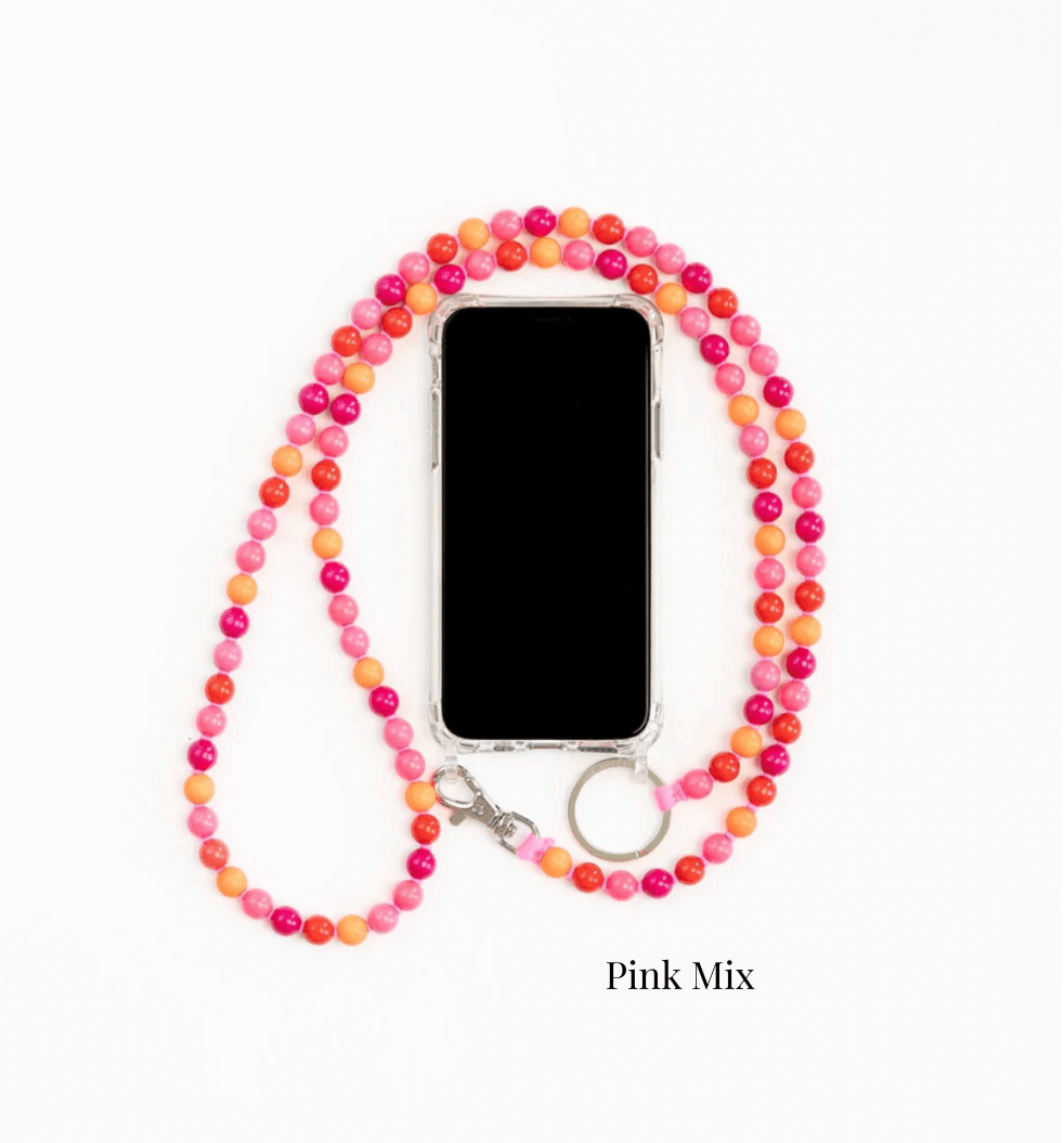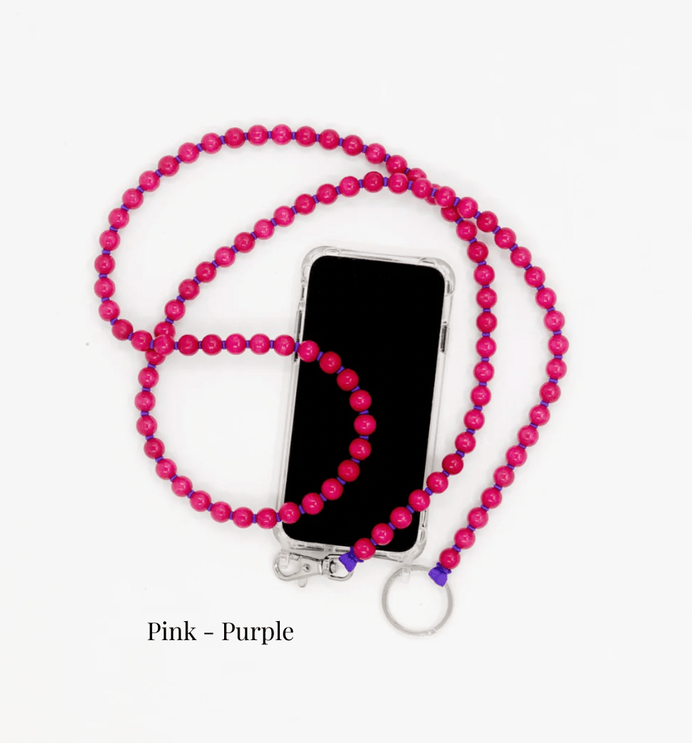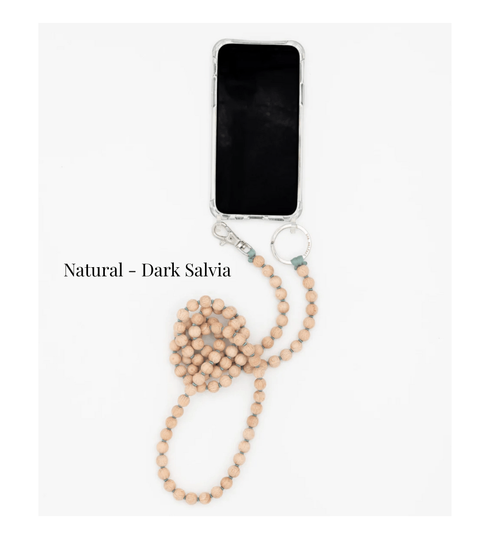 Phone necklace with elastic band and threaded wooden beads.