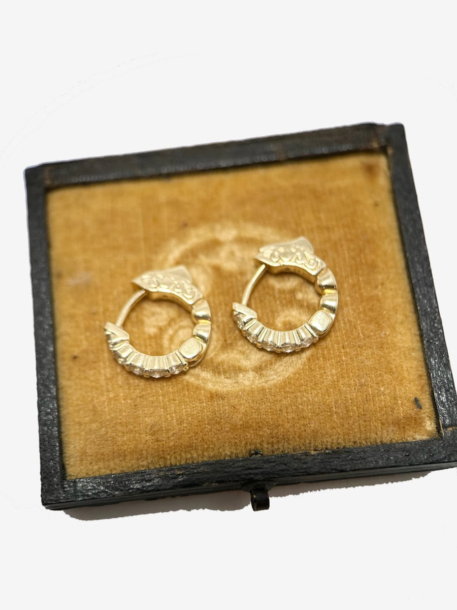 Small gold huggie hoop earrings set with ten round diamonds total.