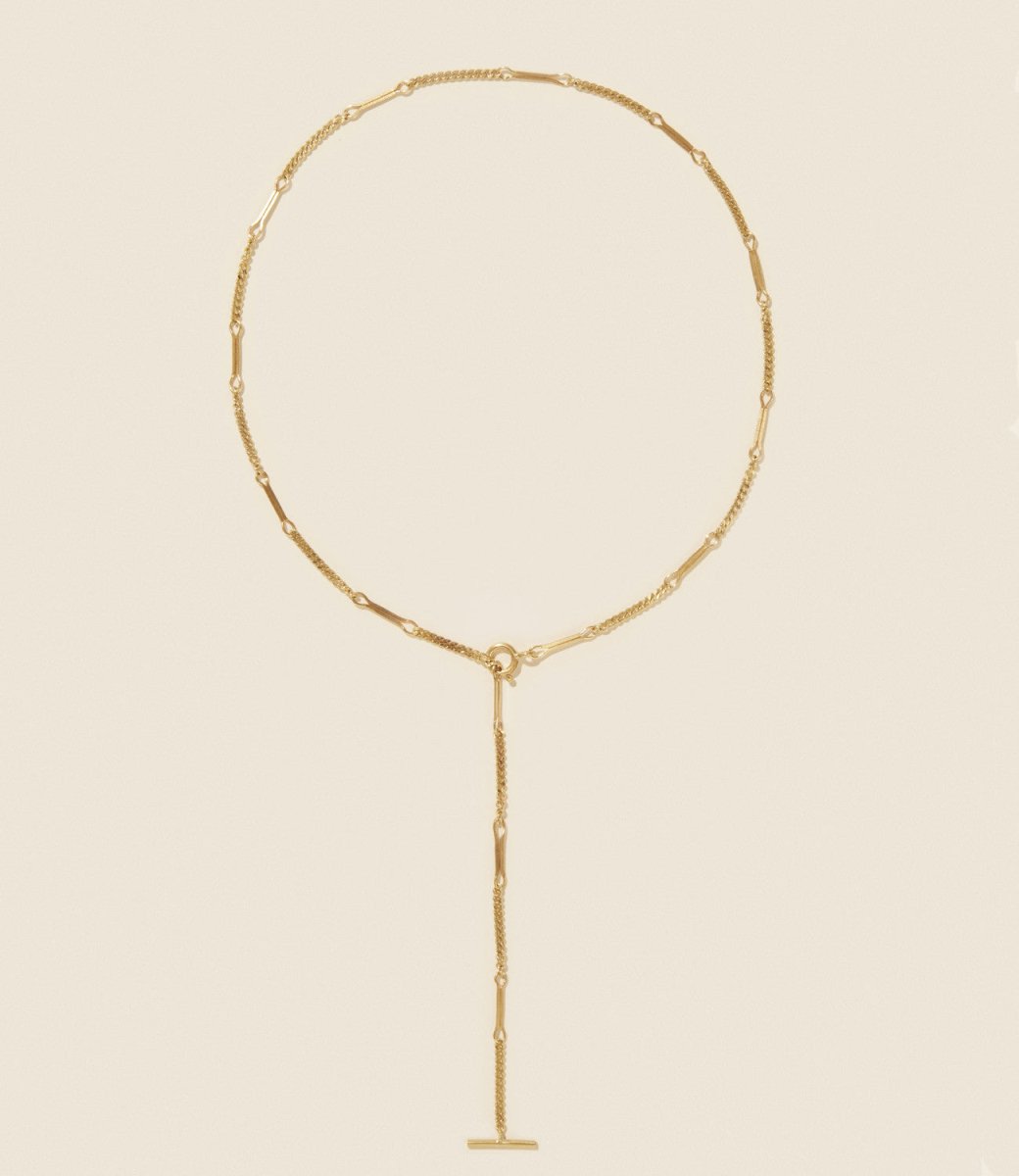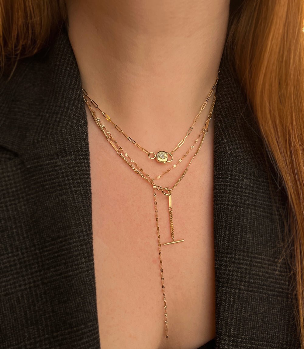 Mixed 9k gold chain T bar necklace with a spring ring clasp. The clasp can connect at your desired length and act as a charm holder!