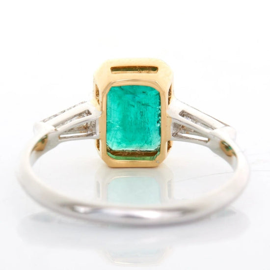 A Brazilian emerald set in yellow gold with tapered diamonds on each side set on a white gold band.