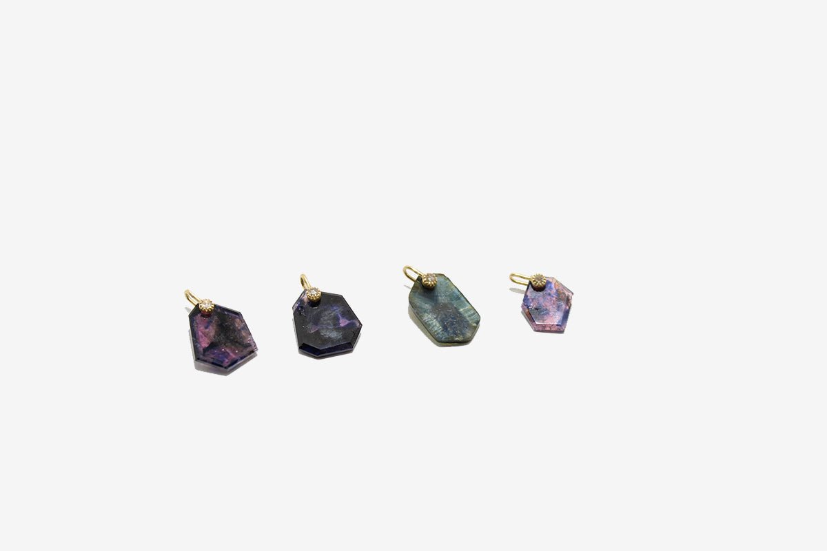 These rare 'Trapiche' sapphire slices are finished with an 18k gold bail set with a diamond on one side and an emerald or ruby on the other. Totally one of a kind!