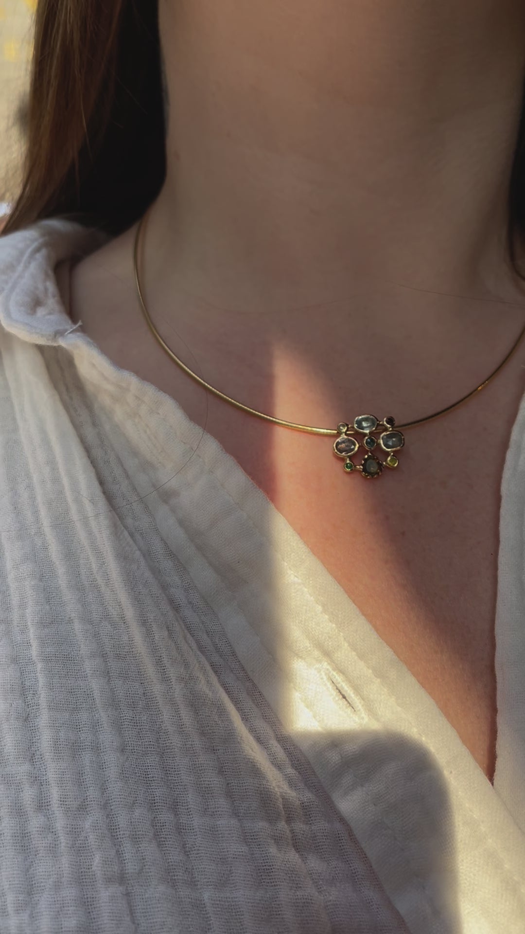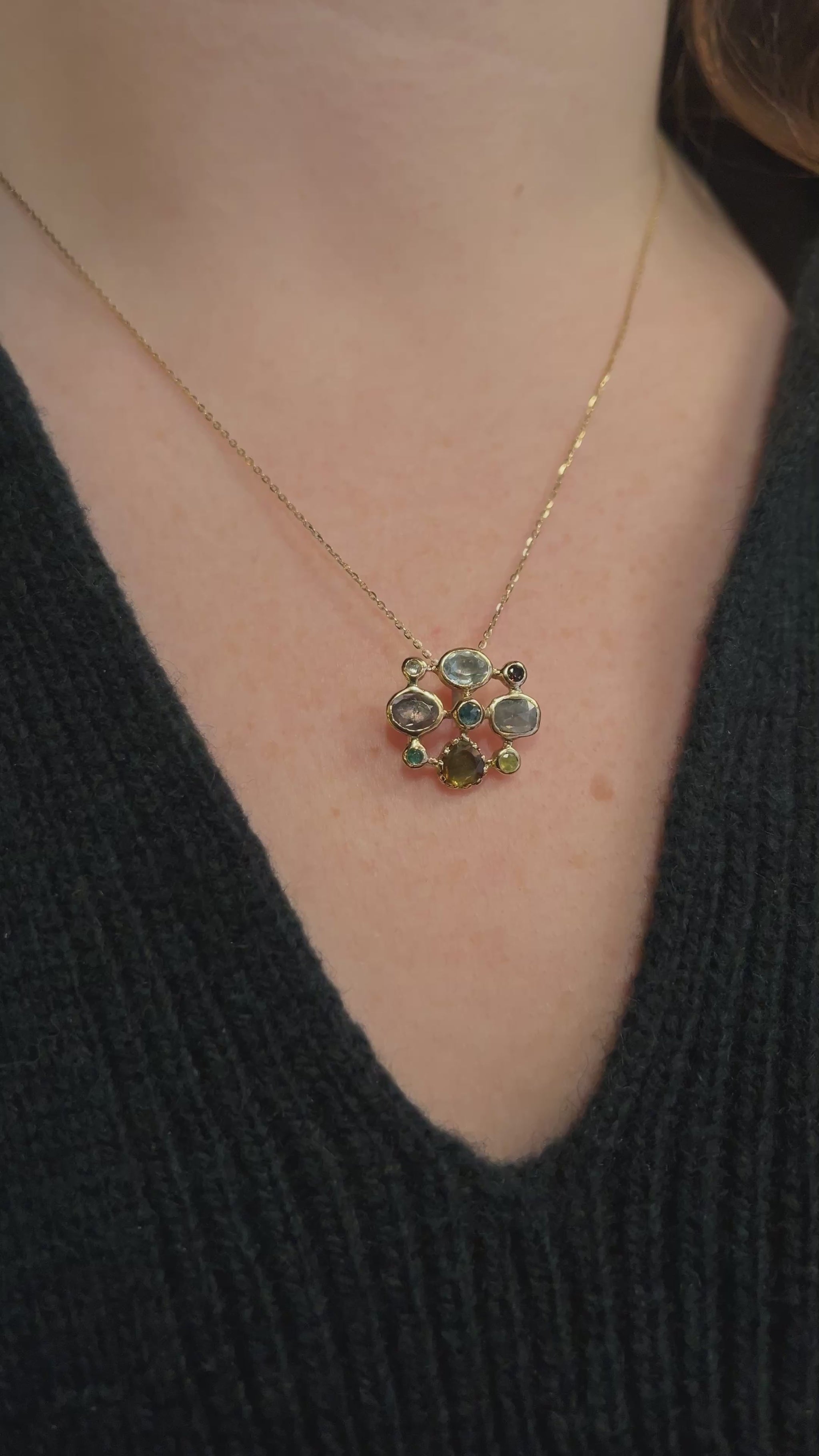 This pendant features a mix of colorful gemstones backed with sterling silver and set in 18k yellow gold.