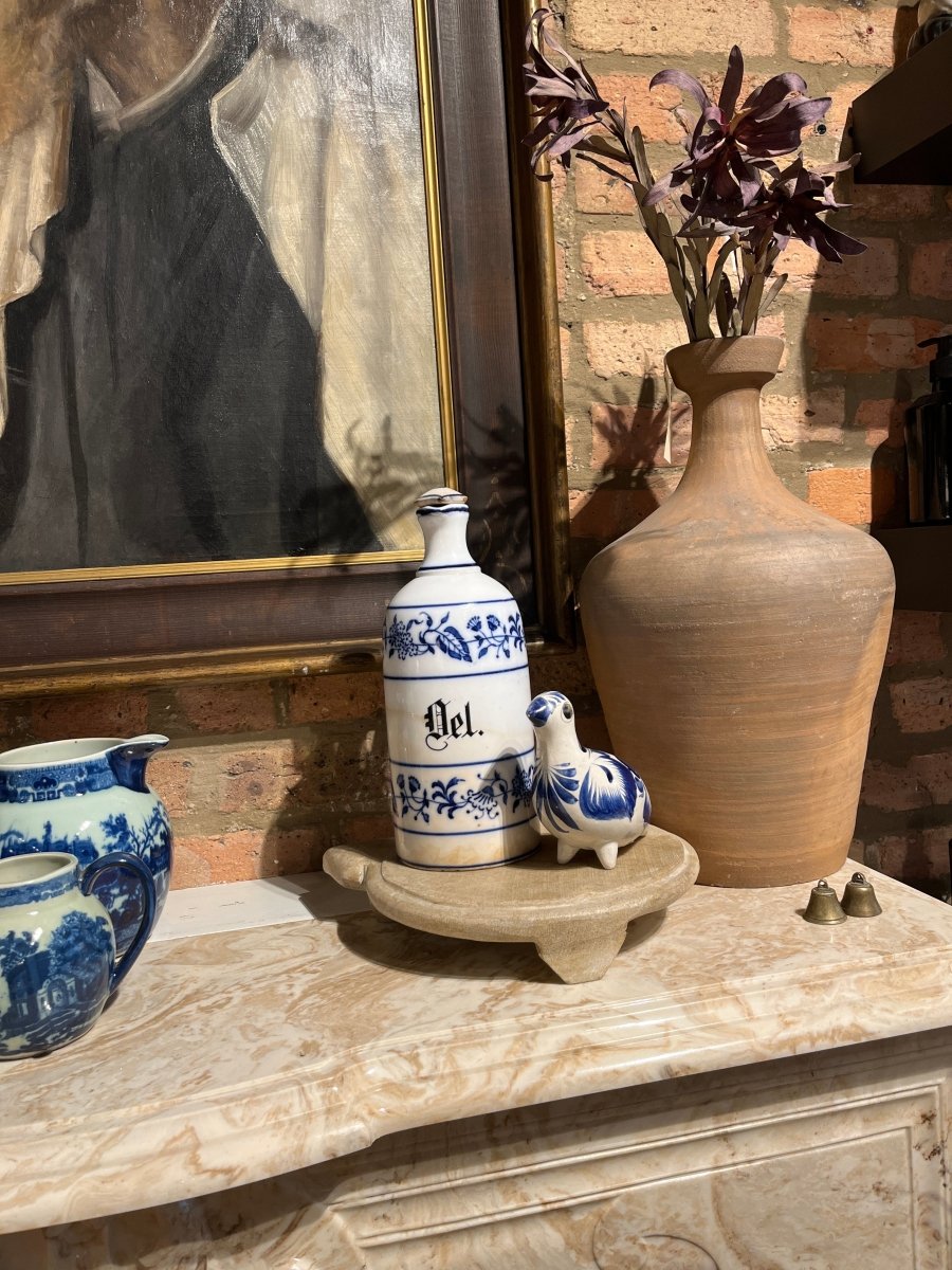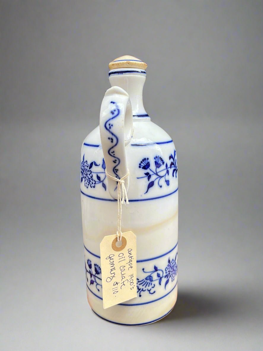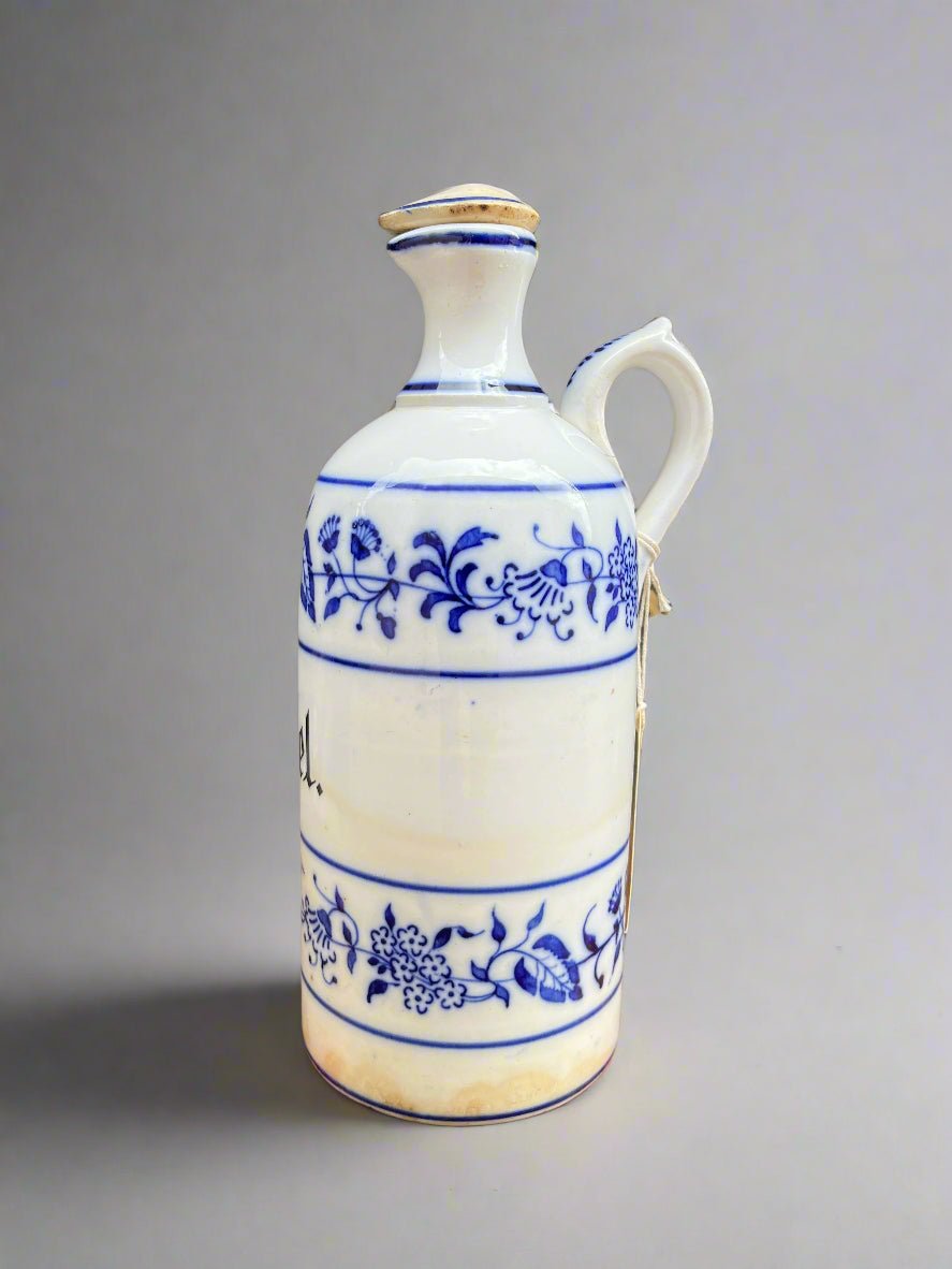 A rare and authentic late 19th-century apothecary oil bottle crafted by Villeroy & Boch at their famed Mettlach factory in Germany. Made of finely glazed stoneware, this blue and white bottle features hand-painted botanical motifs and “Oel.” in classic Gothic script. The underside bears the Villeroy & Boch triangular mark used from 1874 to 1909, along with a painted decorator’s number. With its elegant form and historic charm, this piece is a stunning example of German apothecary ware.