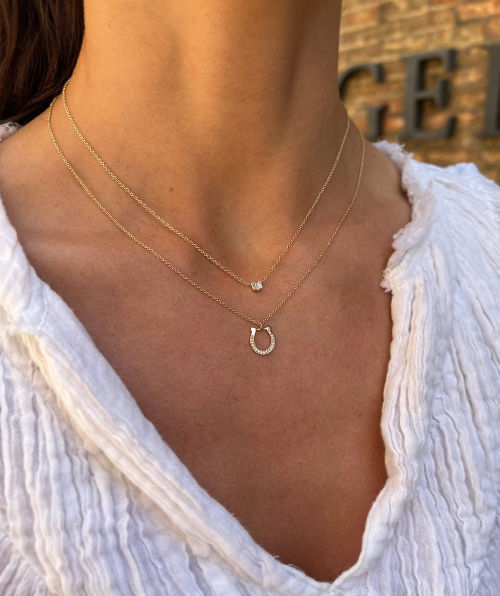 A gold horseshoe pendant set with pave diamonds on a delicate gold cable chain necklace.