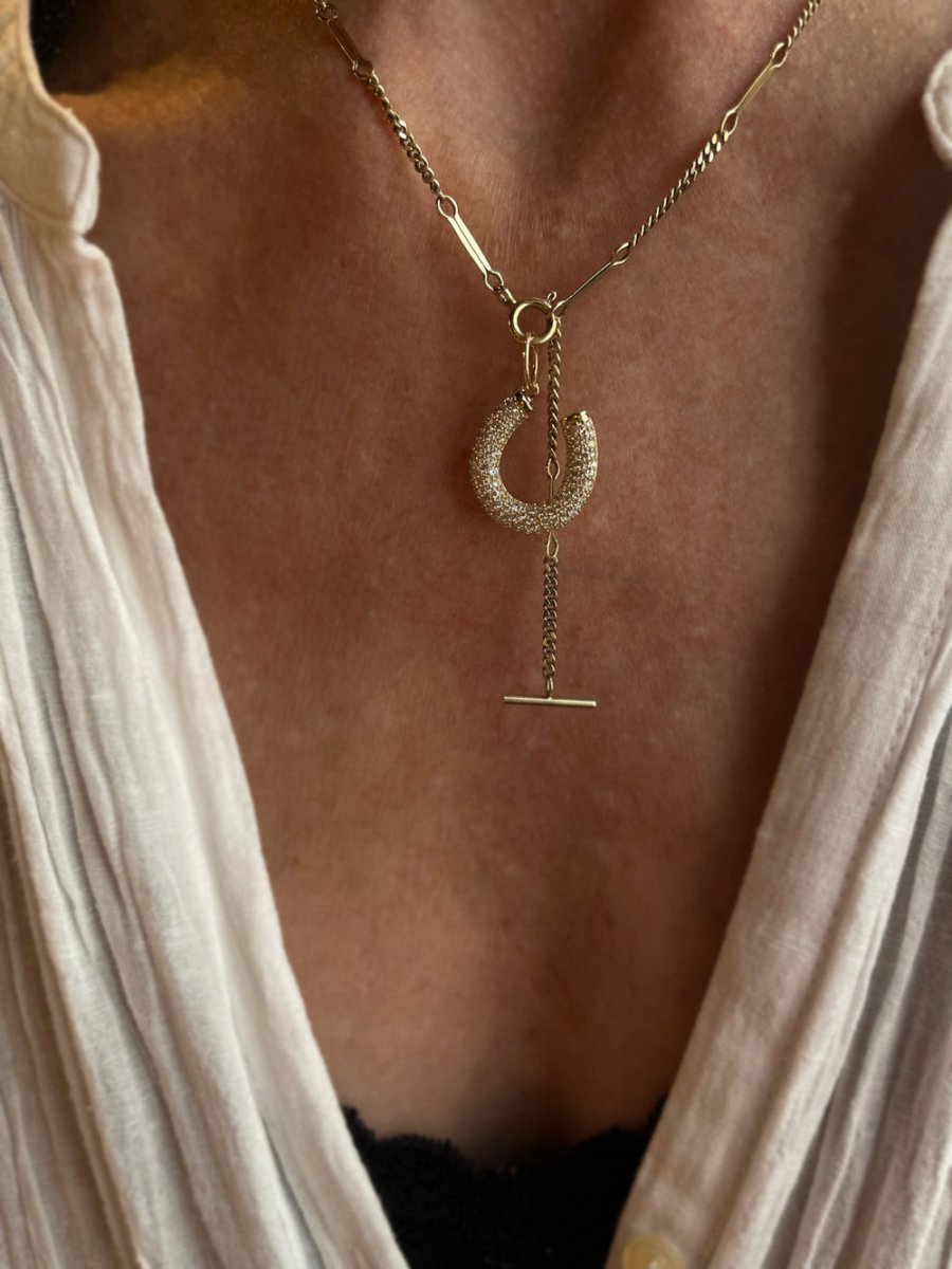 A gold horseshoe pendant set with sparkling white diamonds. Perfect alone on a gold chain or layered with smaller charms.