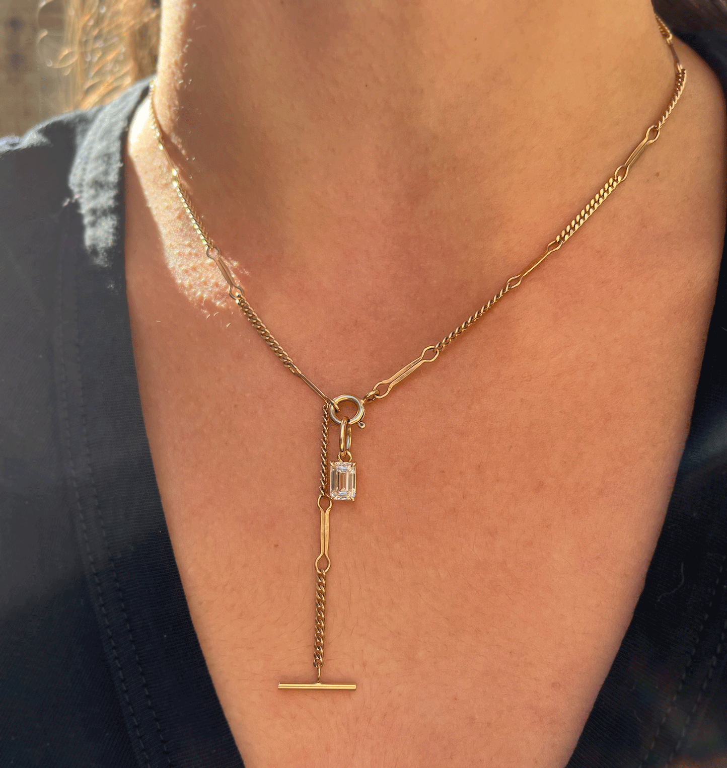 An emerald cut (lab grown) diamond charm in a simple prong setting.