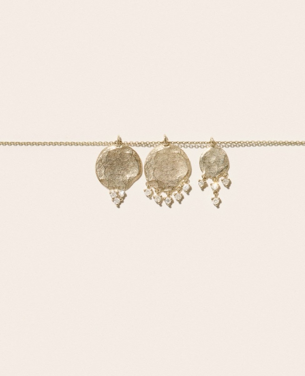 The Gaby collection from Pascale Monvoisin draws inspiration from the texture and sheen of gold leaf with diamonds artfully interwoven. This necklace features three textured gold discs with white diamonds fixed on a delicate gold chain.