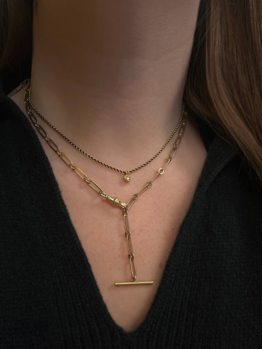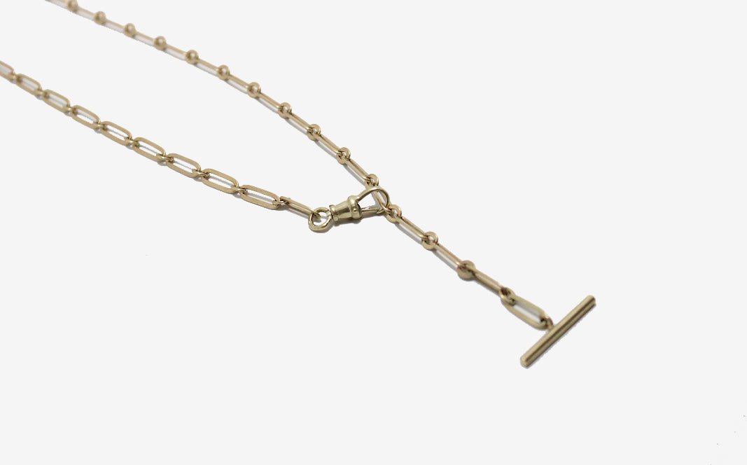 Large link gold chain with a fob clasp that can be connected at any point and used to attach a pendant and style as a lariat with a T-bar dropped from the bottom.